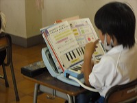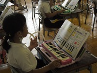 1年生が音楽で鍵盤ハーモニカを練習していました。「たのしくふこう」では、自分の好きな音を音楽に合わせて吹きます。ふきながら鍵盤を押すと、いろいろな音が出るのを楽しみました。