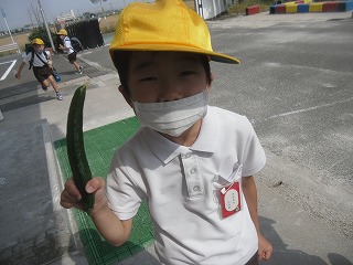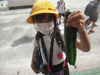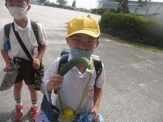 休業中に種をまいたり、苗を植えたりしてあった野菜ですが、休業が終わって子どもたちはそれぞれ自分の野菜を決めて世話をしています。その中でも、キュウリやトマトなどはすでに収穫できるくらいに成長しています。生活科で観察するときや、帰りに水やりに行ったときなど、大きくなった実を収穫します。