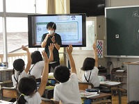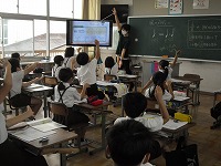 4年生が音楽で、いろいろな記号について学習していました。クレッシェンドやデクレッシェンドを学習するとき、ジェスチャーをしながらだんだん強くやだんだん弱くという記号のイメージを体感していました。