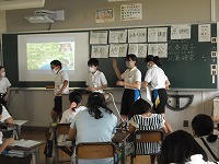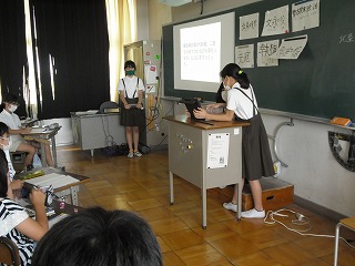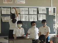 6年生が、社会で鎌倉時代について調べ、まとめたことを、隣のクラスの友達に対して先生になって教えていました。それぞれのグループごとに自分たちが調べたことをタブレットでスライドにして見せながら説明し、