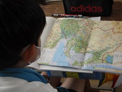 4年生が社会で、愛知県の土地のつかわれ方を学習していました。地図帳の色の違いを見て、土地の標高や土地利用のようすを確かめます。