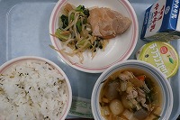 菜飯ご飯 牛乳 鶏肉の醤油麹焼き もやしとなめ茸のお浸し 沢煮椀 洋梨ゼリー