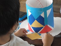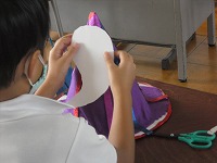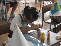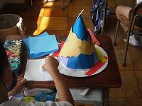 2年生が図工で、自分がかぶれる帽子の飾り付けをしていました。思い思いに色紙や布を切ったり、はったり、線を描いたりしながらデザインしていきます。帽子の形もとんがり帽子やトップハットなど自分の選んだ形なので、楽しく制作しています。