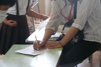 自分でいろいろ練習してから先生にテストしてもらいます。合格したら先生のチェックとともにシールを貼ることができます。