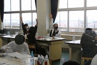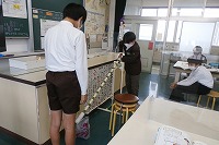 6年生が理科で「てこ」の実験をしていました。同じ重さのものでも支点から持ち上げるものまでの距離を変えると手ごたえが変ります。支点から持ち上げるものまでの距離が同じでも、力点と支点との距離が変わるとまた手ごたえは変わります。実際に持ってみるとその違いははっきり分かります.。