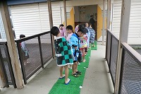 水泳の学習が始まりましたが、気温が低くなかなかプールに入れませんでした。やっと雨が上がりプールに入る子たちを見ると、タオルがとてもカラフルです。着替えの時にも使いやすいようにポンチョのように丸めて首にかぶるようになっていますが、標準服や水着と違って様々な色が競い合っていました。