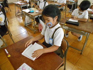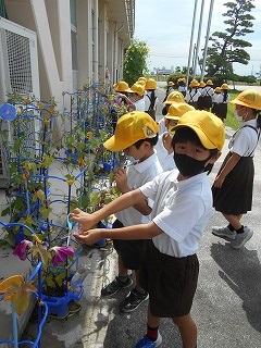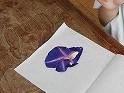 1年生の子どもたちが育てている朝顔は、毎朝たくさんの花を咲かせています。その花を使って、子どもたちは押し花を作りました。