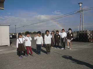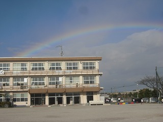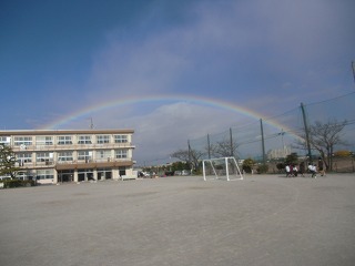 今日の清掃の時間に北東の空に虹がかかりました。給食のころに少し雨がぱらつき、子どもたちが「虹が見える」といっていても当初は薄く見えにくいものでした。しかし、清掃中にだんだんと濃くなって、はっきりとした虹になりました。外で掃除をしている子が最初にしっかりと見ることができました。