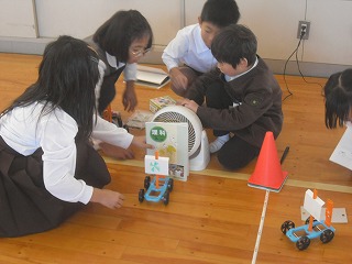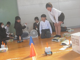 3年生が風の力で動く車の実験をしていました。体育館で各班ごとにサーキュレ-ターを使って車を動かし、メジャーで何メートル進むか測っていました。