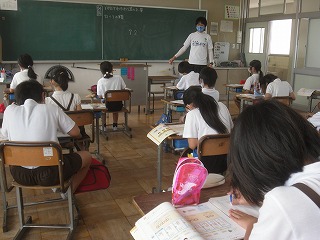 4年生が算数で、割り算のひっ算に取り組んでいました。まずは一桁の数字で割る割り算からですが、きちんと割る数字と割られる数字を書くところから始まります。ノートのマス目に合わせて1ますに1文字ずつしっかりと書くように指導しています。