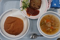 蓮根を使った「れんこんハンバーグ」、水耕レタス、キャベツにトマトたっぷりのソースをかける「添え野菜とトマトソース」、人参、大根、白菜を使った「コンソメスープ」と、全部で6種類の特産物を使ってくれました。「れんこんハンバーグ」と、「添え野菜とトマトソース」を「バンズパン」に挟んで食べてくださいね。