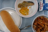 小型ロールパン 牛乳 トマトとナスのチーズ入りミートペンネ 鮭の香草焼き かぼちゃのサラダ