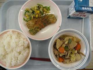 ご飯 牛乳 芋煮 竹輪の磯部揚げ 白菜とコーンの和え物
