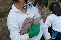 今日の3・4時間目に2年生が薩摩いもほりを行いました。2年生は昨年度に続き2回目ですが、昨年はあまりたくさん採れなかったので今年に期待していました。すると、他の学年同様、今年は大きなものがたくさん採れ、数も多く、あちらこちらで「あった~!」「すごいおおきい!」と声が上がり、休憩時間にも穴を掘ろうとしている子がたくさんいました。両手でなければ持てないくらいの大きなイモを見つけた子もいました。
