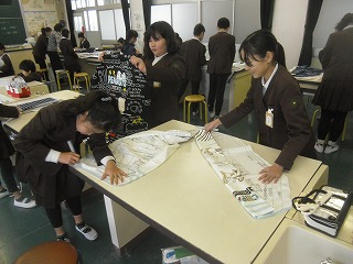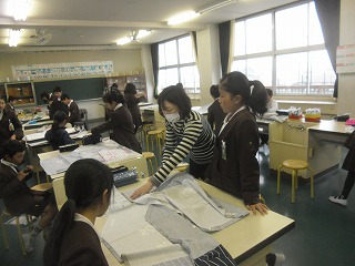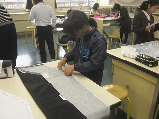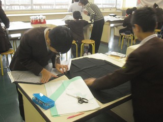 5年生が家庭科でエプロンづくりを始めました。大きな布をエプロンの形に切って、端を折り返し針と糸で縫っていきます。まずは、きれいに切って端の折り目をつけていました。