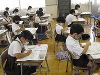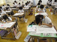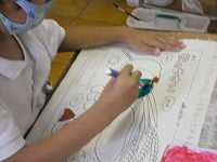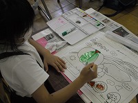 1年生が図工で、絵の具の使い方を練習していました。パレットに絵の具を出すことや筆、水入れの使い方など、順番に行いました。今回は秋の食べ物の絵をもとに色を塗っていきました。