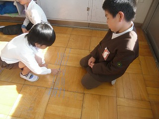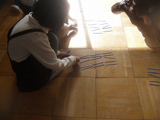 1年生が算数で大きな数について数え棒で考えていました。まずは20本くらいの棒を自分でつかみ数えます。きちんと数えるために「5本」のまとまりを作っていくつ分かかぞえ、「17本だった~」とか、「おしい!21本」とか歓声を上げていました。