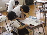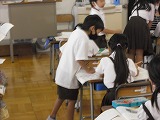 問題の答えが文章のここに書いてあると見つけた後、グループで協力して教えあっていました。