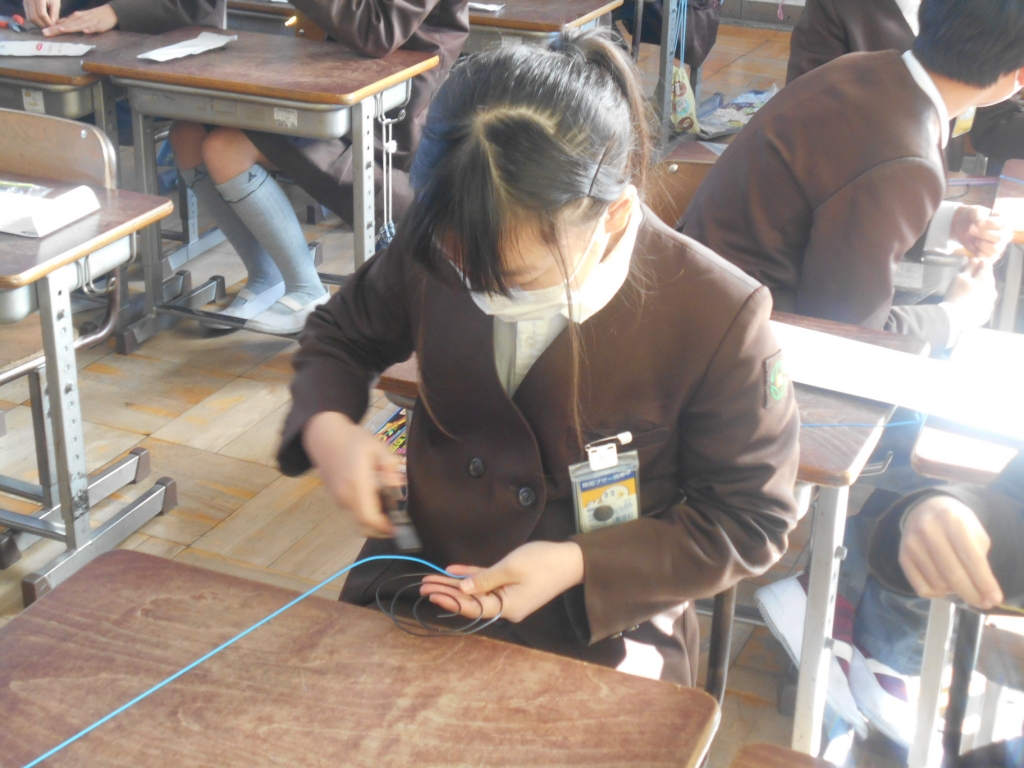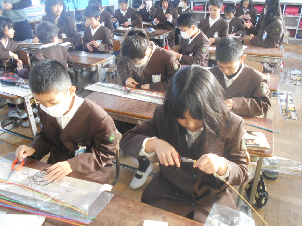 5年生は「立ち上がれマイライン」の作品作りを始めます。針金を伸ばしたり、曲げたりして自立する作品にします。