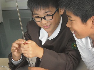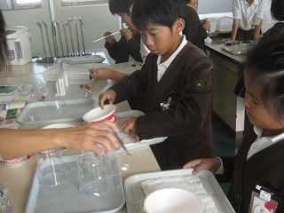 4年生が、理科の「空気と水」の実験で、空気を温める実験を行っていました。