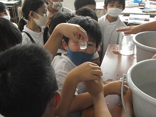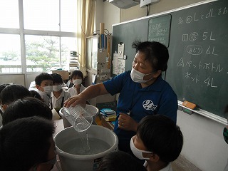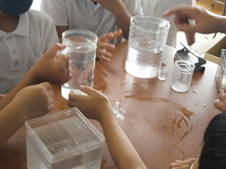 2年生が算数で、かさ(量)の学習をしています。水などの液体の量を、L(リットル)などの単位で表すことはみんなも知っていますが、具体的にどんな量なのかという実感はしていません。そこで、透明のアクリルで作った容器に水を入れて、手に持って重さを感じたり、移し替えて何倍分か数えたりと「かさ」を体験していました。