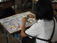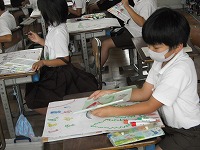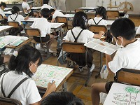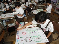 3年生が図工でポスターを制作していました。「家庭の日」や「緑化運動」など、思い思いにデザインし、色塗りを始めました。