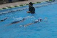 5年生が体育で今年最後の水泳の授業をしていました。児童それぞれが記録に挑戦しました。ある者は何m泳げるか距離に挑戦し、ある者は50mや100mをどのくらいの時間で泳げるか、速さに挑戦していました。