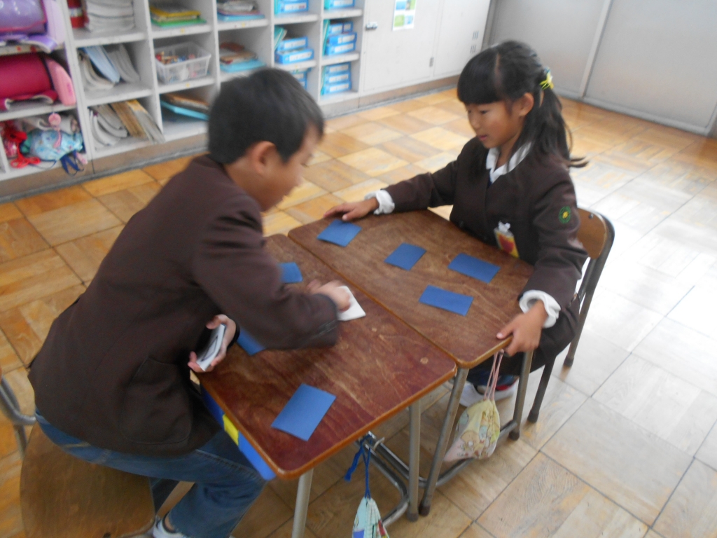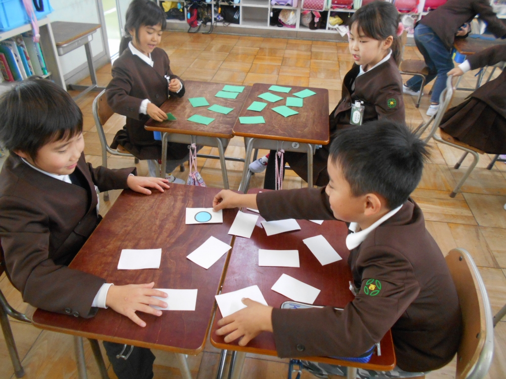 2年生は、ALTさんと英語の勉強をしました。「これは何ですか?」「リンゴです」などの言い方を練習したり、カードに書かれた図形を英語で言って、神経衰弱をしたりしました。