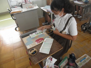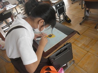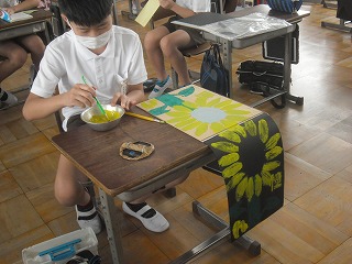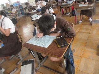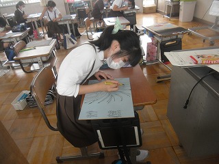 6年生が、版画に取り組んでいました。これは5年生の最後に行うものですが、これまでなかなか進めることができなかったそうです。好きな花を大きく書いて、文字や言葉をレイアウトします。早く彫っている子は、どの色を塗るか考えていました。