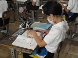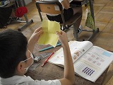 4年生が算数で垂直と並行について学習しています。言葉として知ってはいても、垂直や並行をきちんと説明するのは難しいですね。今回は紙を折って直線を作り、その線を重ねるようにもう一度折ることで直角(垂直)を作っていました。