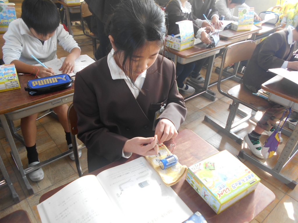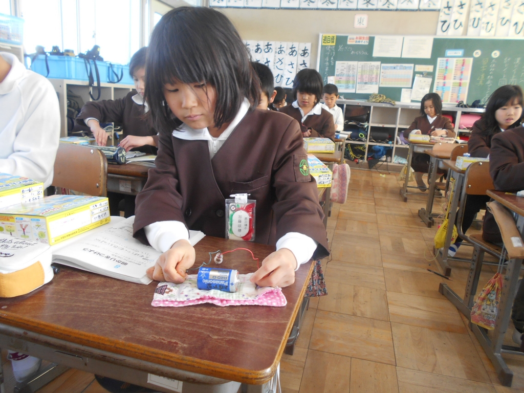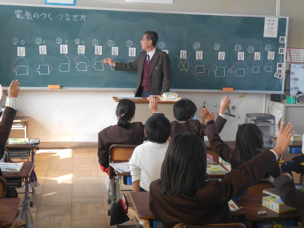 3年生は、豆電球がどんなつなぎ方の時につくか、予想を立てて実験しました。