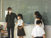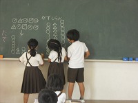 1年生が算数の数合わせのまとめをしていました。合わせて10になる数や足し算、引き算、ドットプロット(数を比べるためのグラフのもとになるもの)の基礎を確認していました。