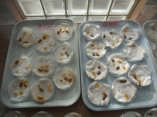 植物の種の発芽に必要な条件を調べるために、シャーレの中には、どれも同じ植物の種が置いてあるのですが、少しずつ違った条件になっています。例えば、「水があるかないか」であったり、「光が当たっているかいないか」であったりです。