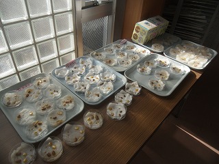 5年生が理科の観察のために廊下にたくさんのシャーレを並べてあります。