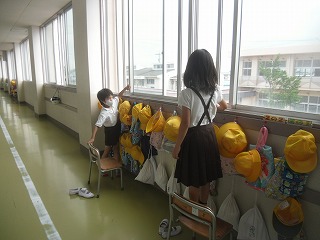低学年の子が、いすなどを台にして開けていました。ありがとう、ごくろうさま。