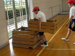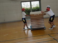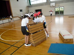 5年生の体育は、跳び箱を使って、台上前転に取り組んでいました。跳び箱を使うと、とてもたくさんの準備が必要です。跳び箱本体はもちろん、踏切版や着地用のマット、滑り止め用のシートも必要です。そのため、みんなは協力と分担を使い分けて準備と片づけを行っています。