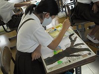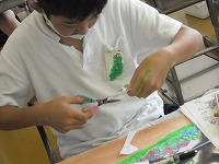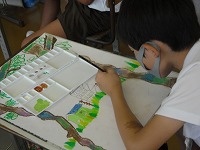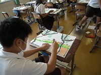 を書いてきましたが、そこに自分の姿など人を描き入れます。ただ突っ立っている棒のような人の姿ではなく、動きのある人を書くためにいろいろなポーズを工夫していました。別の紙に描いて、はさみで切り取って貼ろうとしている子もいました。