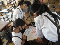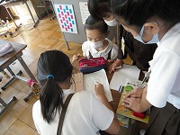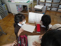 4年生が計画している学年運動会の準備で、賞状を作成していました。文字だけの賞状でなく、絵を描いたりカラフルな色を付けたり、作る方ももらう方もうれしい賞状を考えていました。イラストの本を参考にしているグループもありました。