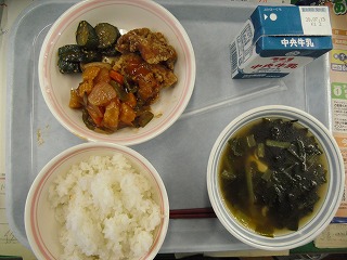 ご飯 牛乳 カラフル酢鶏(すどり) キュウリの香り和え わかめスープ