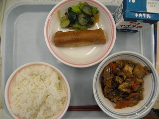 ご飯 牛乳 生揚げの中華炒め 愛知の野菜春巻き 糸寒天の黒酢漬け