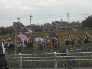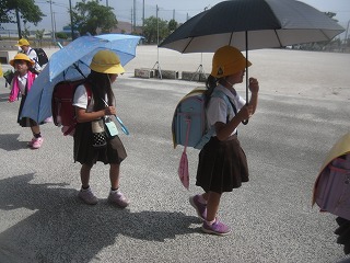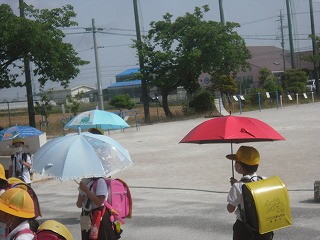 また、日差し対策として、傘(雨傘・日傘どちらでもよい)をさすことを勧めています。そうすると、自然に人と人との間隔もあいてきてコロナ対策にもなると思います。ただ、風の強い日だとあおられたりすることが心配なので、状況を見て使い分けを考えたいと思います。