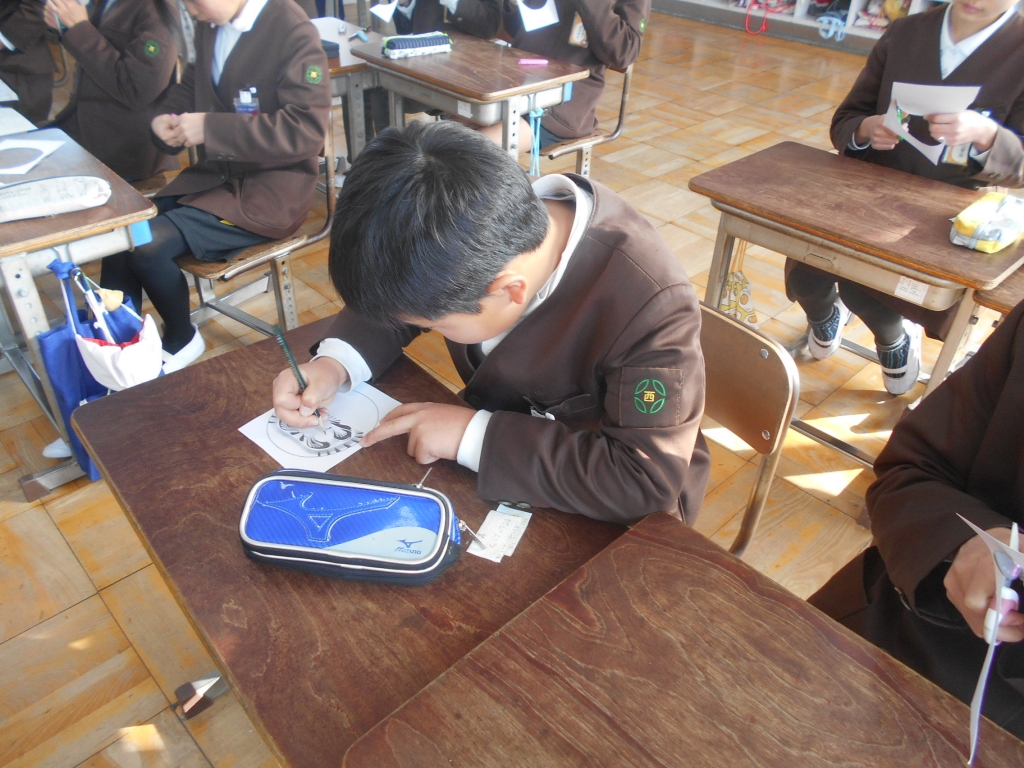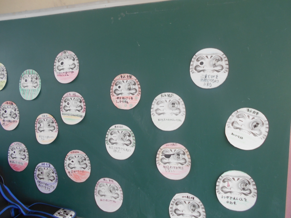 4年生は、だるまの絵に目標を記入しました。だるまの目が描けるようにがんばります。
