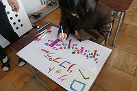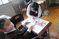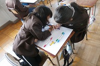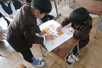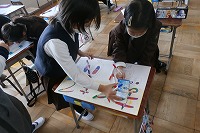 2年生が取り組んでいるおもちゃランドのポスターを制作していました。どんなタイトルなのか、どんな遊びなのかがわかるように、画用紙に題名を書くとともに、絵をかいたり言葉で説明したりします。話し合い、色塗りなども協力して作っています。