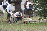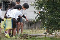 1年生が生活科で秋を見つけにビオトープなどを観察していました。落ち葉や枯れ草などの植物や、隠れている虫、水の中の生き物など、見つけたものをタブレットで撮影し記録に取っていました。