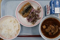 ご飯 牛乳 秋刀魚のかば焼き 紫(ゆかり)和え 根菜たっぷり豚汁