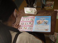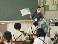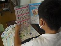 5年生が英語で、いろいろな場面での決まった言い方を学習していました。通常のあいさつのほかに、相づちを打ったり、お礼に対する返事をしたりと、様々な言い方を教えてもらいました。