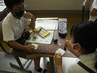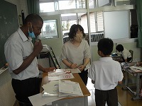 5年生が、英語で「can(できること)」や「job(仕事)」について何というか学習していました。その仕事をしている人の絵を描いてニック先生に見せ、この人はどんな人ですかと質問してもらいます。その質問に対して、英語で説明するのですが、まず質問してもらいやすい絵を描くところからみんな悩んでいました。