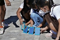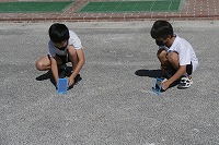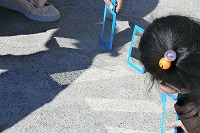 3年生が理科で、鏡で反射した光がどう進むのかを実際に確かめていました。ただ反射させただけでは光が見えません。どうすれば反射した光が見えるのか工夫して、地面に光をあてるために低い位置に鏡を置いて進む光を地面に映していました。