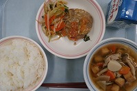ご飯 牛乳 蓮根ハンバーグの味噌トマトソースかけ 愛西三つ葉の三色和え 芋の子汁