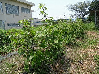 咲きませんでした。しかし、マルチシートを敷いて雑草を減らし、手入れの仕方も向上した結果、今年は一番大きいもので1.5m程度まで大きくなり、1うね丸ごとしっかり成長して花も咲いています。